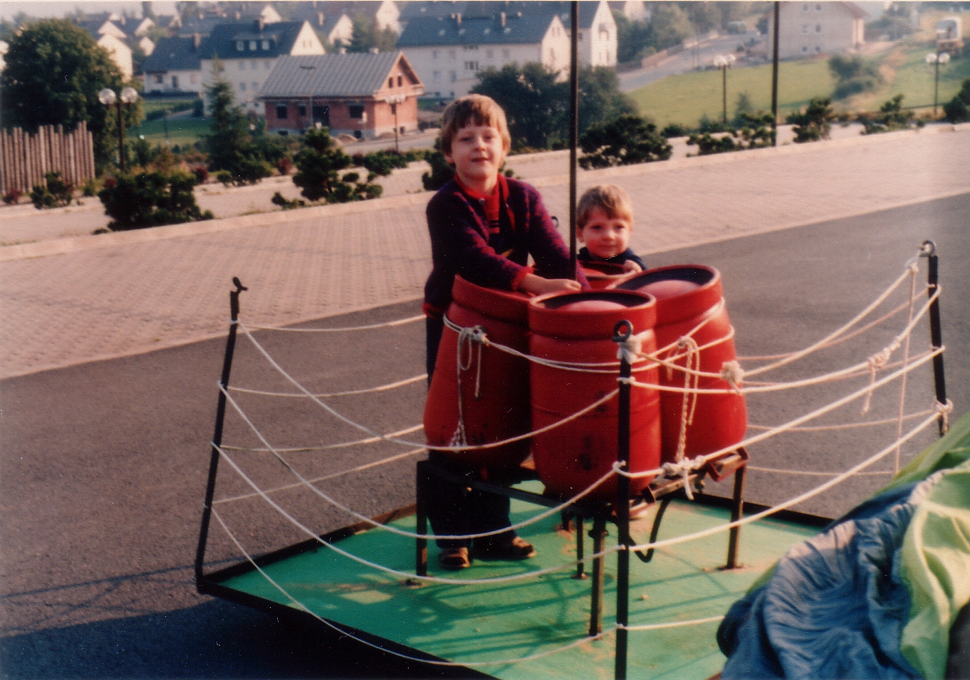 Der erste Ballon wurde aus Futterstoff einer Lederfabrik gefertigt, der in ausreichender Menge vorhanden war. Den Brenner bauten sie nach dem Prinzip eines Ofenrohrs, durch das Propangas aus einer Flasche strömt, entzündet und mit einem Ventil geregelt wird. Der Korb bestand aus einer selbstgebauten Plattform mit einem einfachen Geländer. Da sich die Hülle als zu luftdurchlässig erwies, imprägnierten sie sie teilweise. Nach einem vorzeitig abgebrochenen Testlauf wurde die Hülle auf dem folgenden Transport weitestgehend zerstört und schließlich aus Vorsicht verbrannt.